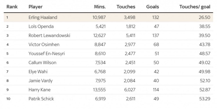 自2020年1月18日,哈兰德代表多特蒙德首秀以来,欧洲五大联赛球员平均进球所需触球次数统计
