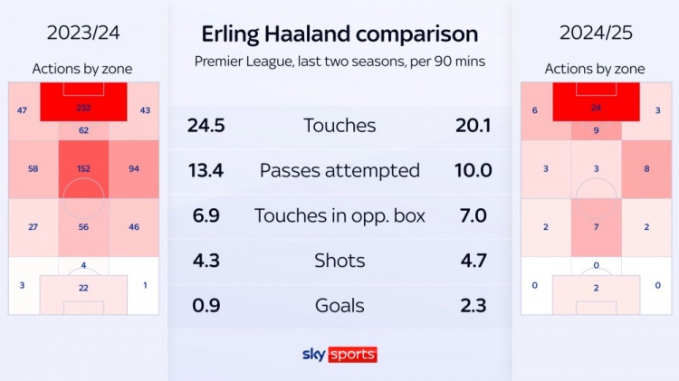 瓜迪奥拉知道,哈兰德在禁区内就是“怪物”一般的存在,而且是一位在禁区外很少触球的世界顶级球员——当然,哈兰德也没必要这样做。