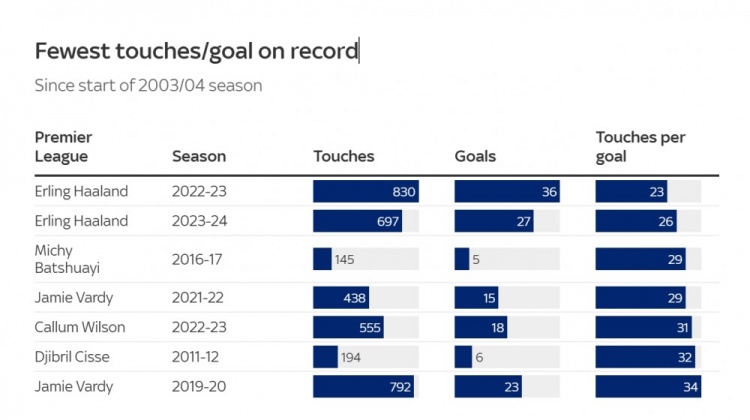 进一步解释一下,在哈兰德对阵西汉姆联的24/25赛季英超第三轮比赛中上演帽子戏法后,这位挪威前锋平均9.7场比赛就能上演一次帽子戏法。而他平均每次射门只有6次触球,也是欧洲球员中最低的。