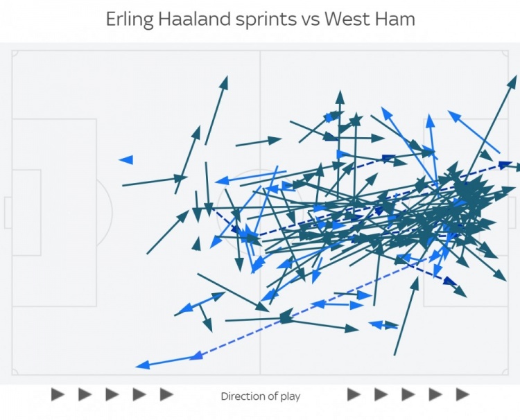 哈兰德在对阵西汉姆联之时的跑动分布图